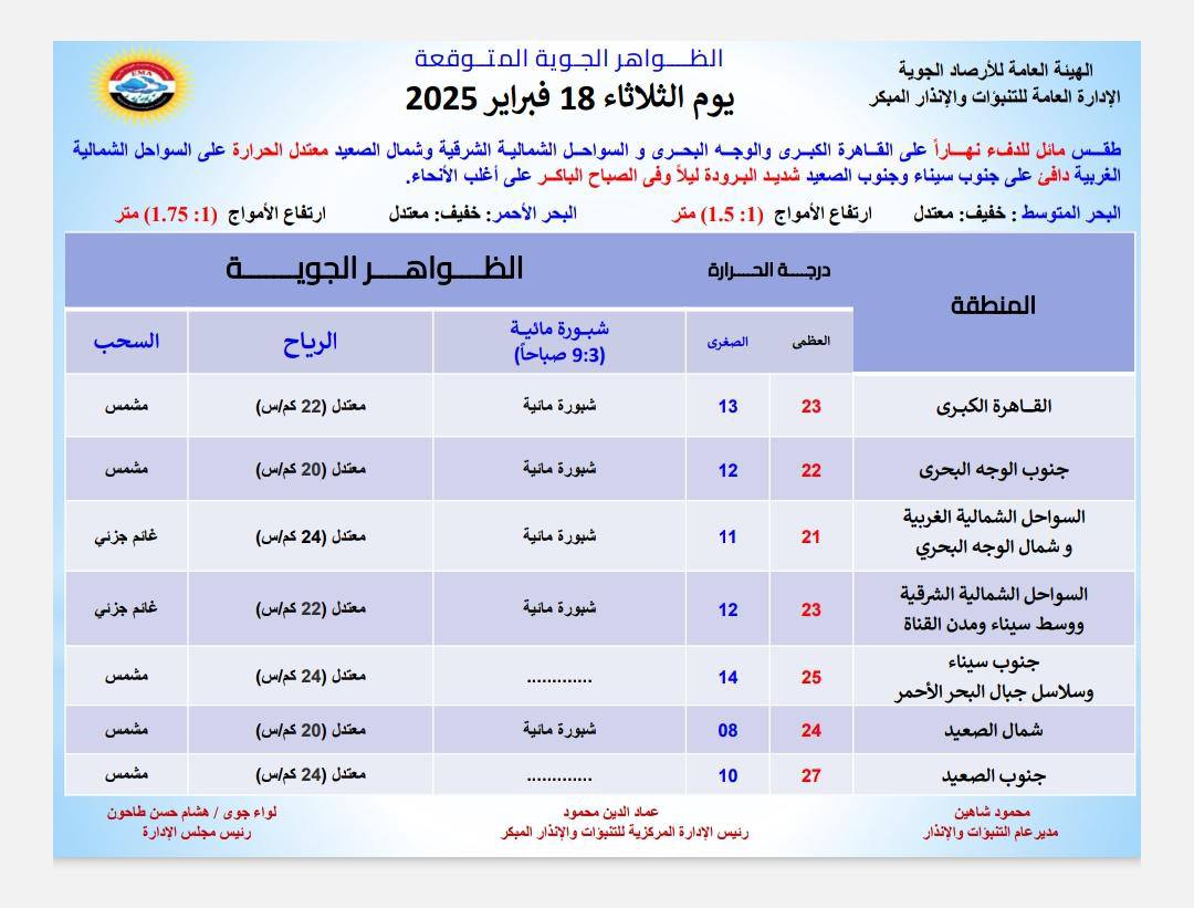 وتسجل درجات الحرارة العظمى والصغرى، اليوم الثلاثاء، على القاهرة الكبرى والأقاليم وفقا لهيئة الأرصاد كالتالي: