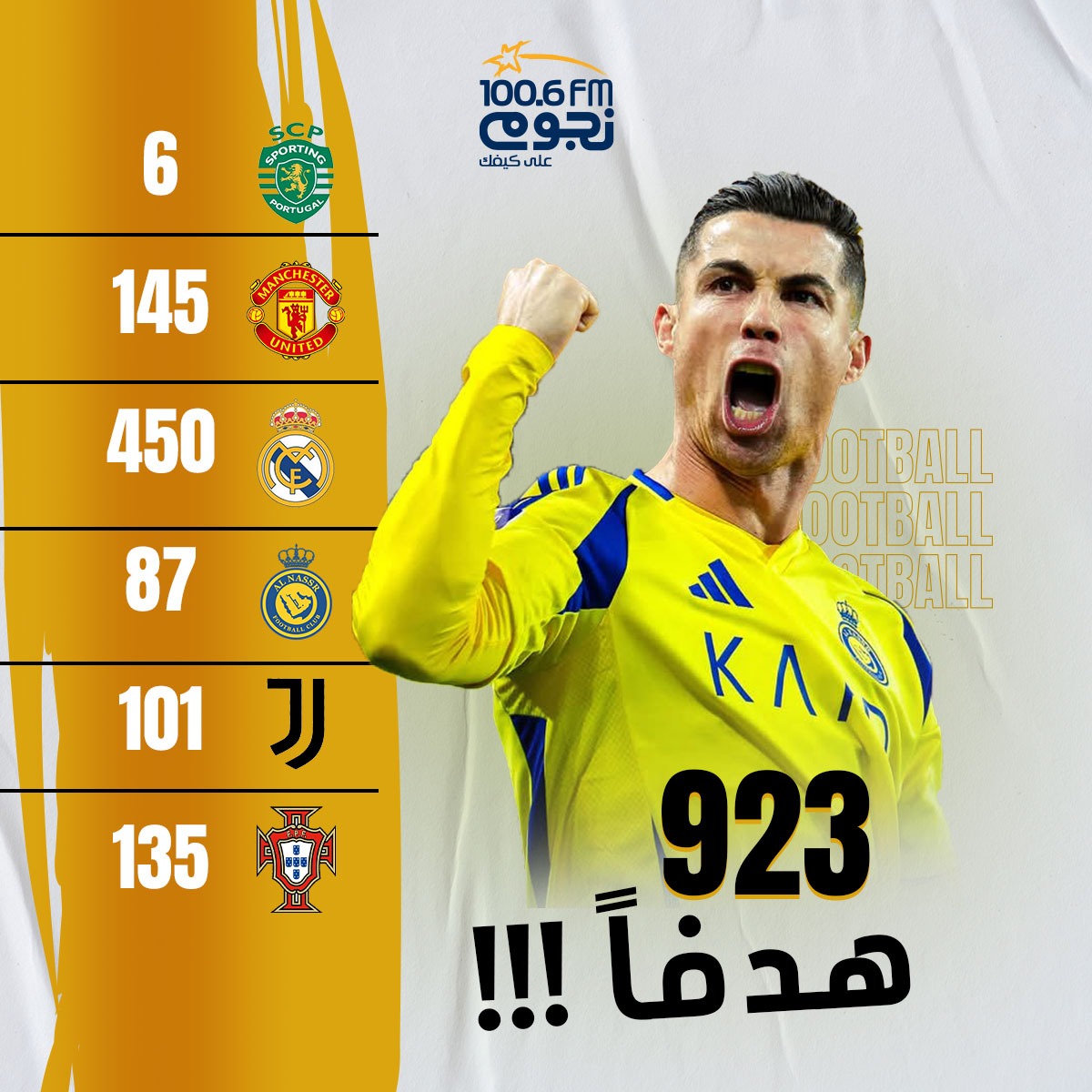 وجاءت أهداف رونالدو بواقع 5 أهداف مع سبورتنج لشبونة، 145 هدفاً مع مانشستر يونايتد، 450 هدفاً مع ريال مدريد، 101 هدف مع يوفنتوس، 87 هدفاً مع النصر، و135 هدفاً مع منتخب البرتغال.