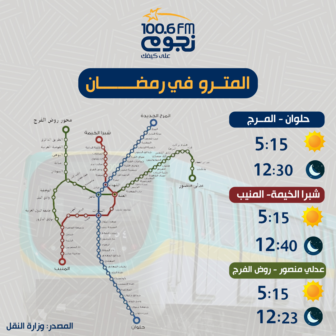 – بداية ساعات التشغيل للخط الأول لمترو الأنفاق من محطات: “حلوان – المرج الجديدة” الساعة 5:15 صباحًا وقيام آخر قطار من محطة حلوان الساعة 12:15 صباحًا ومن محطة المرج الجديدة الساعة 12:30 صباحًا.