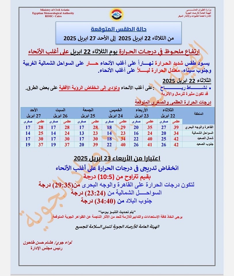 أعلنت هيئة الأرصاد الجوية، عبر حسابها الرسمي على موقع «فيسبوك» عن توقعاتها لحالة الطقس اليوم الثلاثاء 22 أبريل 2025.