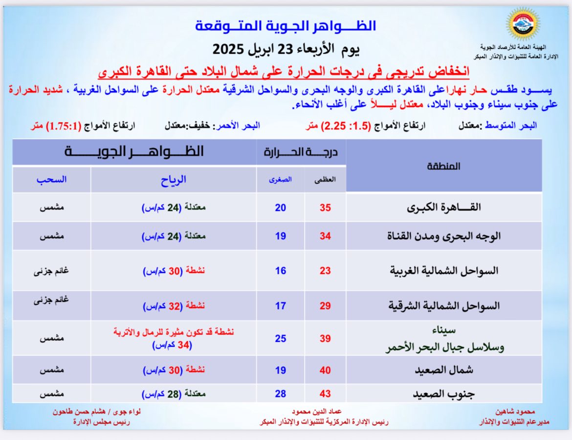 أعلنت هيئة الأرصاد الجوية، عبر حسابها الرسمي على موقع «فيس بوك» عن توقعاتها لحالة الطقس اليوم الأربعاء 23 أبريل 2025.
