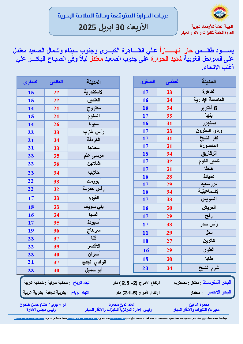 أوضحت هيئة الأرصاد الجوية عبر صفحتها الرسمية على «فيسبوك» توقعات طقس اليوم الأربعاء 30 أبريل.