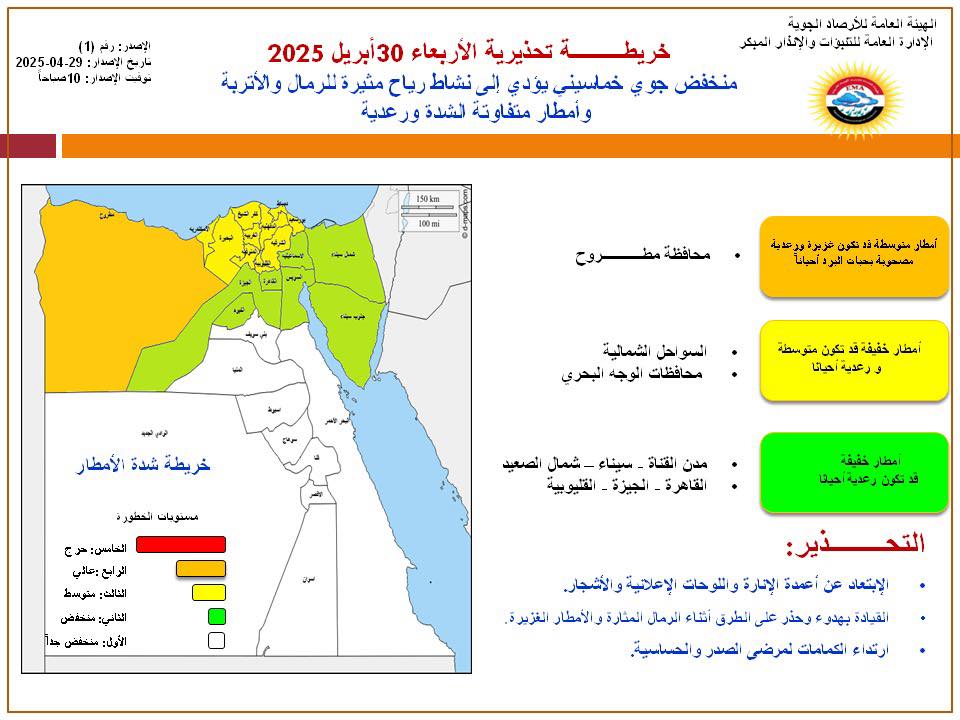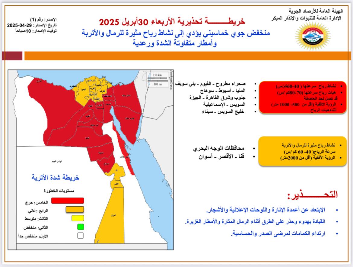 – نشاط رياح تصل سرعتها من (60:40) كم/س تكون مثيرة للرمال والأتربة على أغلب الأنحاء وقد يصاحبها هبات رياح تتراوح (80:70) كم/س قد تؤدي إلى تدهور الرؤية الأفقية إلى أقل من 1000 متر وقد تصل إلى حد العاصفة على مناطق من شمال الصعيد وجنوب وشرق القاهرة الكبرى ومدن القناة وخليج السويس وسيناء.