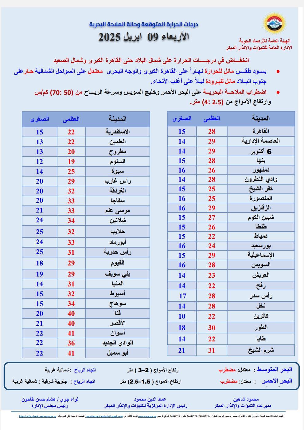 أعلنت هيئة الأرصاد الجوية، عبر صفحتها الرسمية على «فيسبوك» عن توقعاتها لحالة الطقس اليوم الأربعاء 9 أبريل 2025.