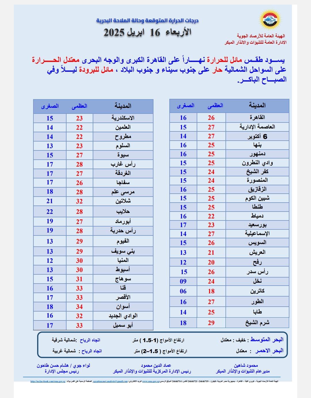 أعلنت هيئة الأرصاد الجوية، عبر صفحتها الرسمية على «فيسبوك» عن توقعاتها لحالة الطقس اليوم الأربعاء 16 أبريل 2025.