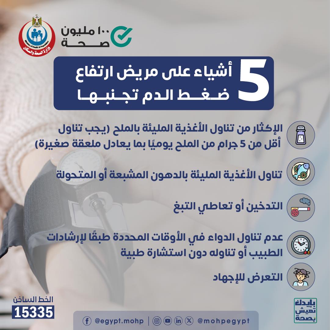 أوضحت وزارة الصحة والسكان عبر حسابها الرسمي على موقع «فيس بوك»، عن 5 أشياء يجب على مرضى ارتفاع ضغط الدم تجنبها.