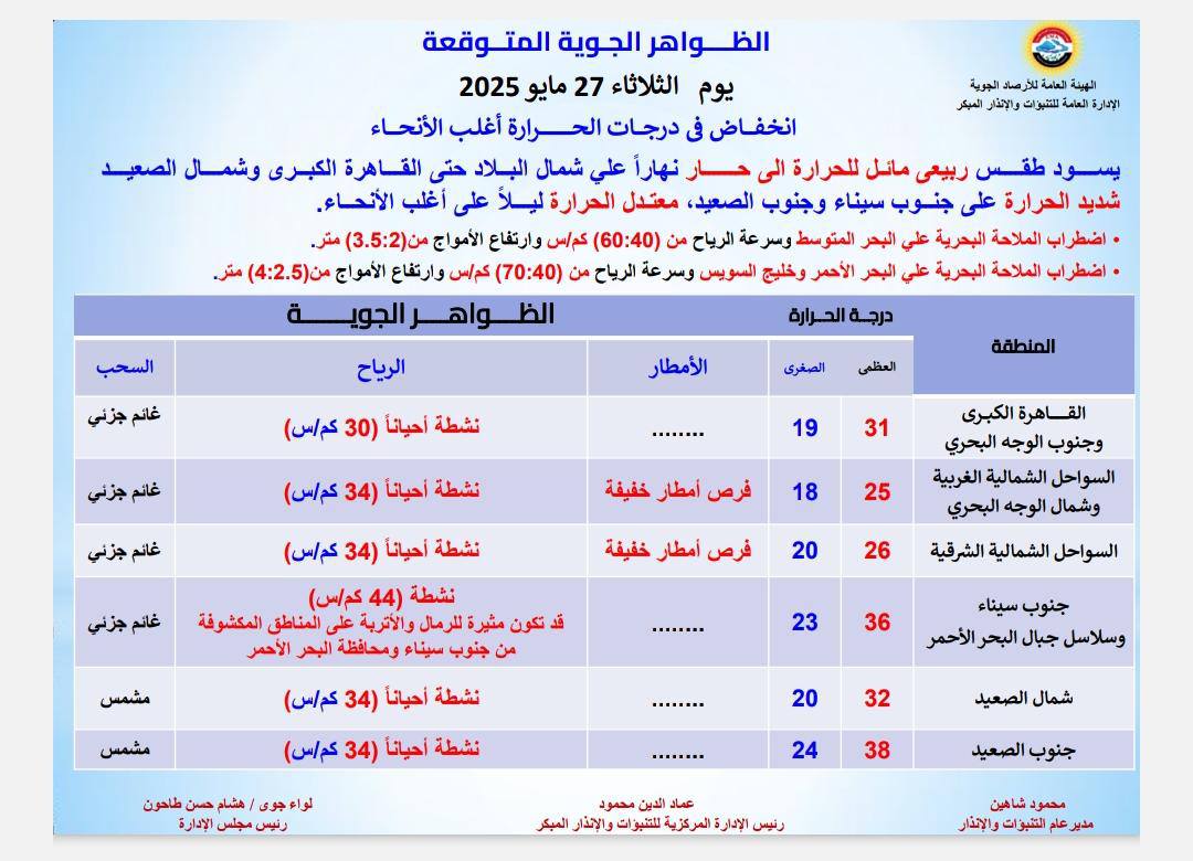 أعلنت هيئة الأرصاد الجوية عبر حسابها الرسمي على موقع «فيسبوك»، عن توقعاتها لحالة الطقس اليوم الثلاثاء 27 مايو 2025.