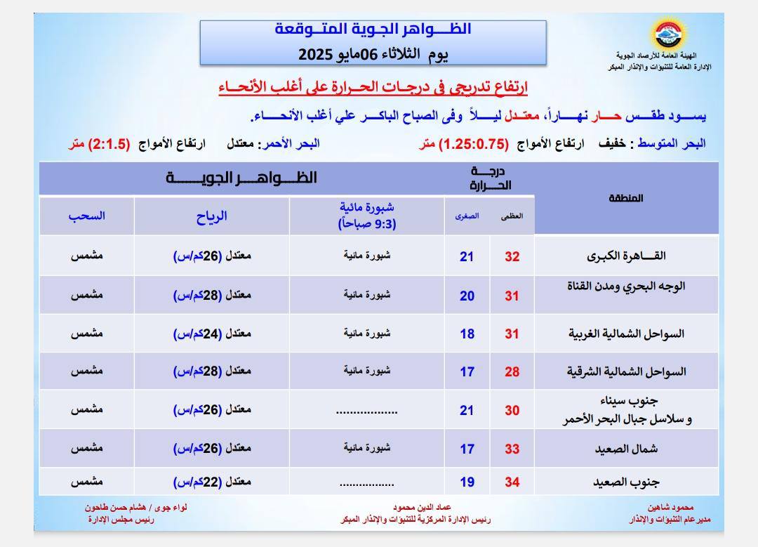 أعلنت هيئة الأرصاد الجوية عبر حسابها الرسمي على موقع «فيسبوك»، عن توقعاتها لحالة الطقس اليوم الثلاثاء 6 مايو 2025.