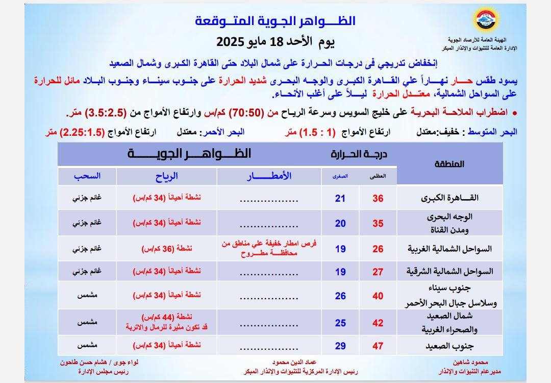 أعلنت هيئة الأرصاد الجوية عبر حسابها الرسمي على موقع «فيس بوك»، عن توقعاتها لحالة الطقس اليوم الأحد 18 مايو 2025.
