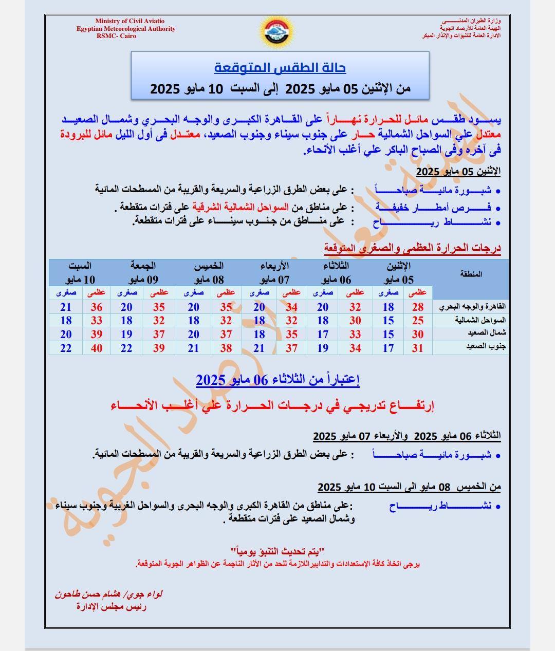 أعلنت هيئة الأرصاد الجوية عبر حسابها الرسمي على موقع «فيس بوك»، عن توقعاتها لحالة الطقس اليوم الإثنين 5 مايو 2025.
