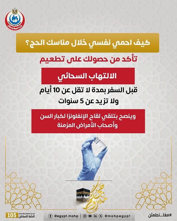 وقالت «الصحة» إنه يجب الحصول على تطعيم الالتهاب السحائي قبل السفر بمدة لا تقل عن 10 أيام ولا تزيد على 5 سنوات، موضحة أنه يُنصح بتلقي لقاح الإنفلونزا لكبار السن وأصحاب الأمراض المزمنة.