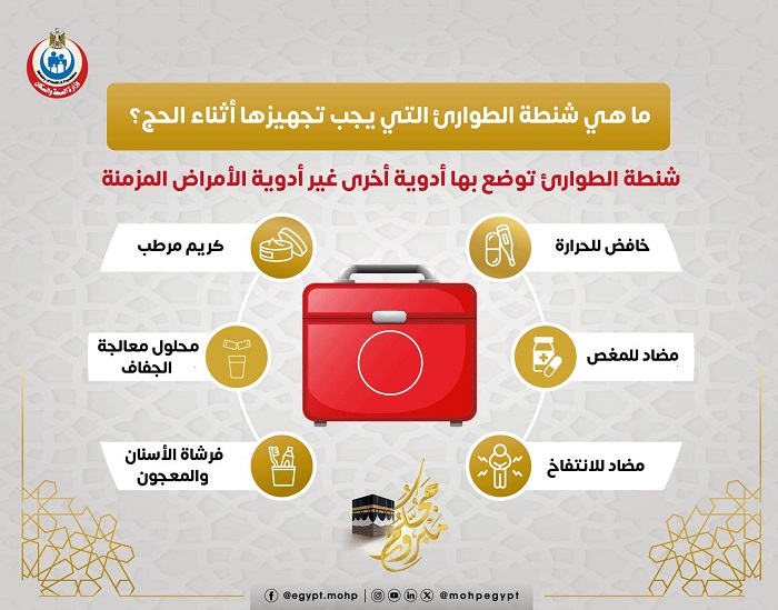 قالت الوزارة إنه يجب على المسافرين لأداء مناسك الحج، اصطحاب شنطة طوارئ توضع بها أدوية أخرى غير أدوية الأمراض المزمنة، وتتضمن: