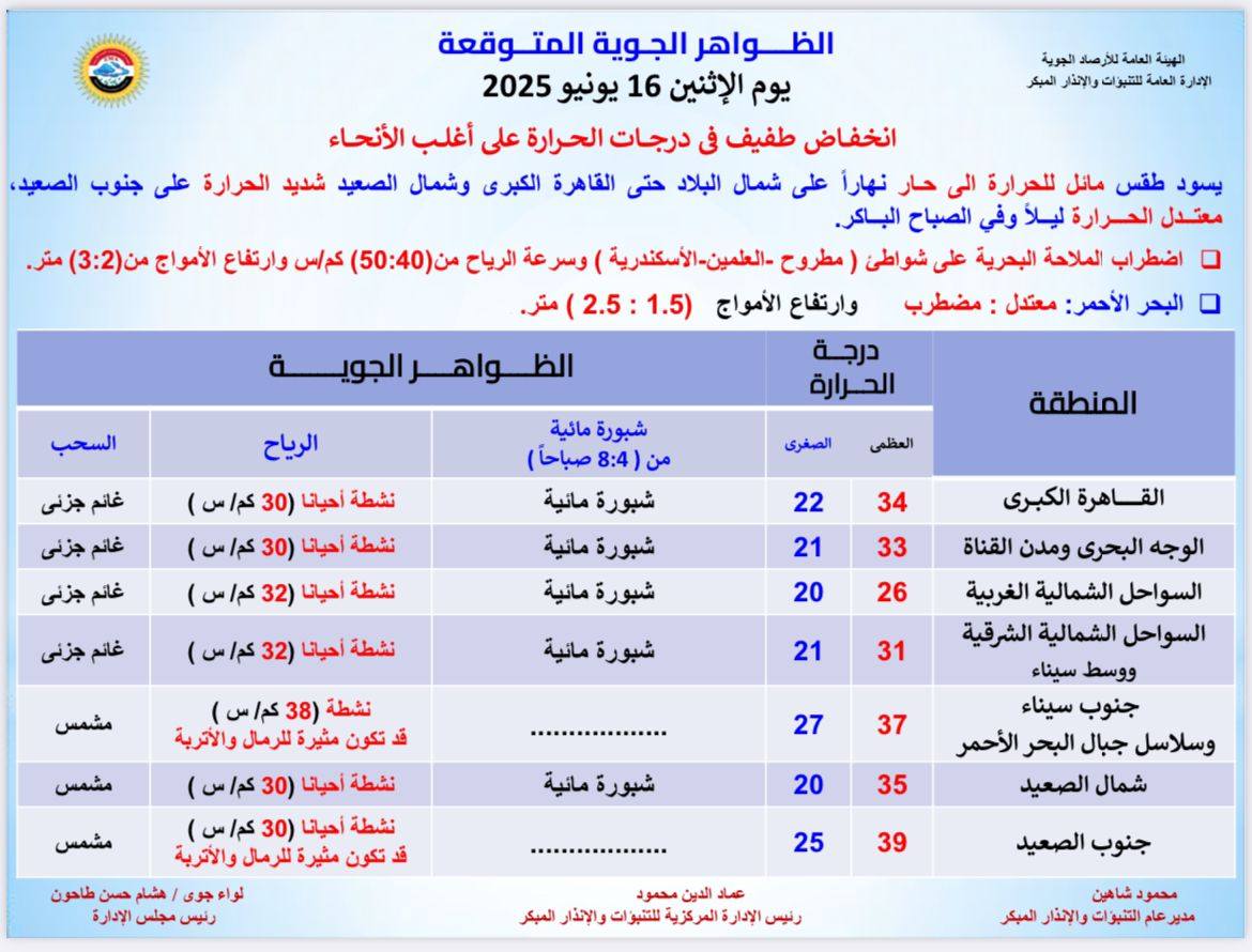 أعلنت هيئة الأرصاد الجوية عبر حسابها الرسمي على موقع «فيس بوك»، عن توقعات حالة الطقس اليوم الإثنين 16 يونيو.