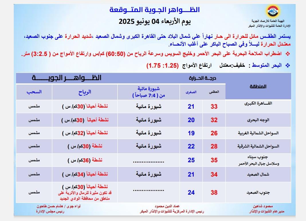 أعلنت هيئة الأرصاد الجوية عبر حسابها الرسمي على موقع «فيس بوك»، عن توقعاتها لحالة الطقس اليوم الأربعاء 4 يونيو.