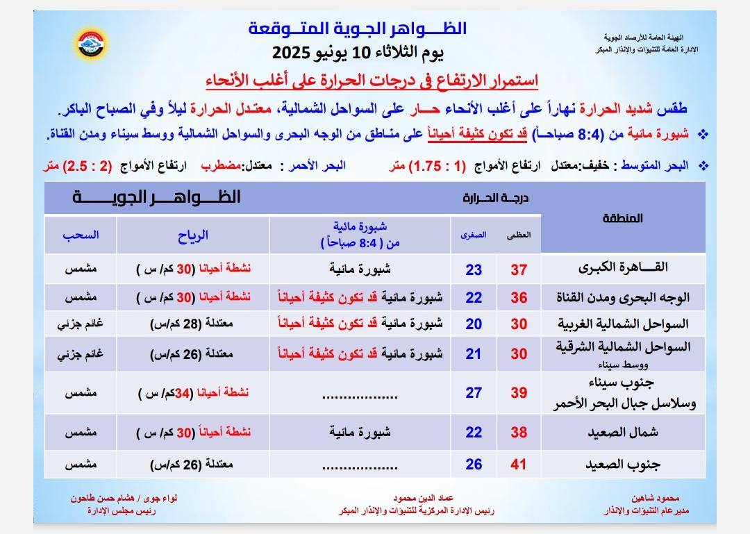 أعلنت هيئة الأرصاد الجوية عبر حسابها الرسمي على موقع «فيسبوك»، عن توقعاتها لحالة الطقس اليوم الثلاثاء 10 يونيو.