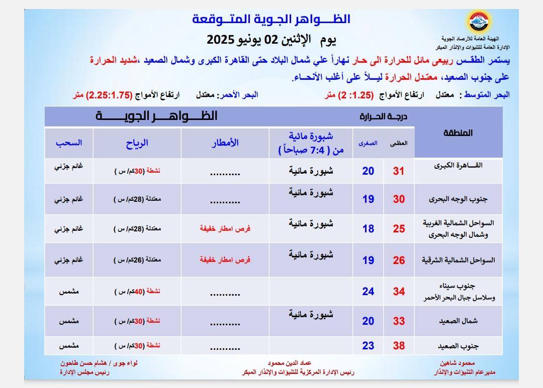 أعلنت هيئة الأرصاد الجوية عبر حسابها الرسمي على موقع «فيس بوك»، عن توقعاتها لحالة الطقس اليوم الإثنين 2 يونيو.