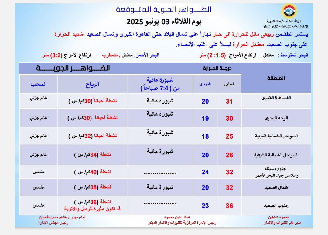 أعلنت هيئة الأرصاد الجوية عبر حسابها الرسمي على موقع «فيسبوك»، عن توقعاتها لحالة الطقس اليوم الثلاثاء 3 يونيو.