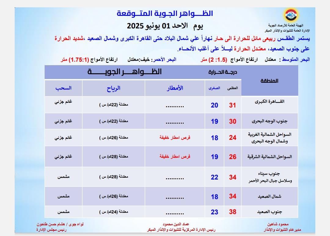 أعلنت هيئة الأرصاد الجوية عبر حسابها الرسمي على موقع «فيس بوك»، عن توقعاتها لحالة الطقس اليوم الأحد 1 يونيو 2025.