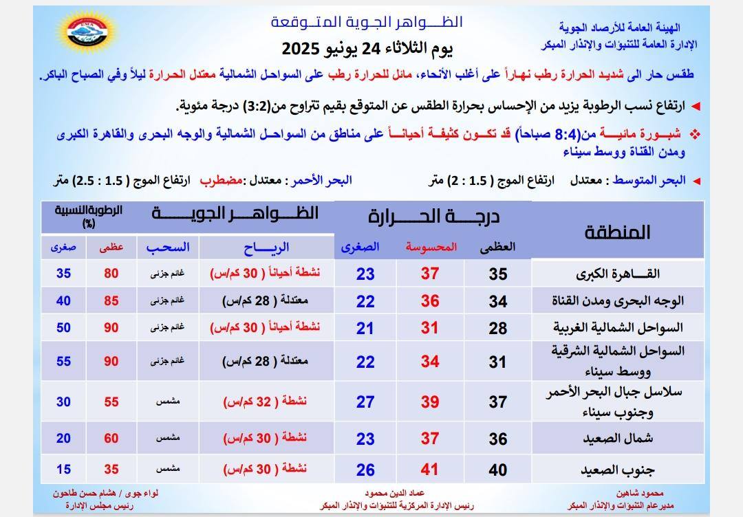 أعلنت هيئة الأرصاد الجوية عبر حسابها الرسمي على موقع «فيسبوك»، عن توقعات حالة الطقس اليوم الثلاثاء 24 يونيو.