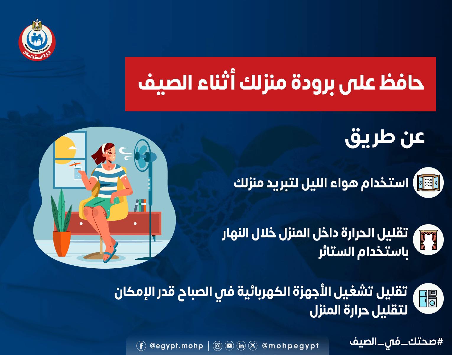 في السياق ذاته، أوضحت وزارة الصحة عبر حسابها الرسمي على «فيس بوك»، طرق الحفاظ على برودة المنزل خلال فصل الصيف، وهي: