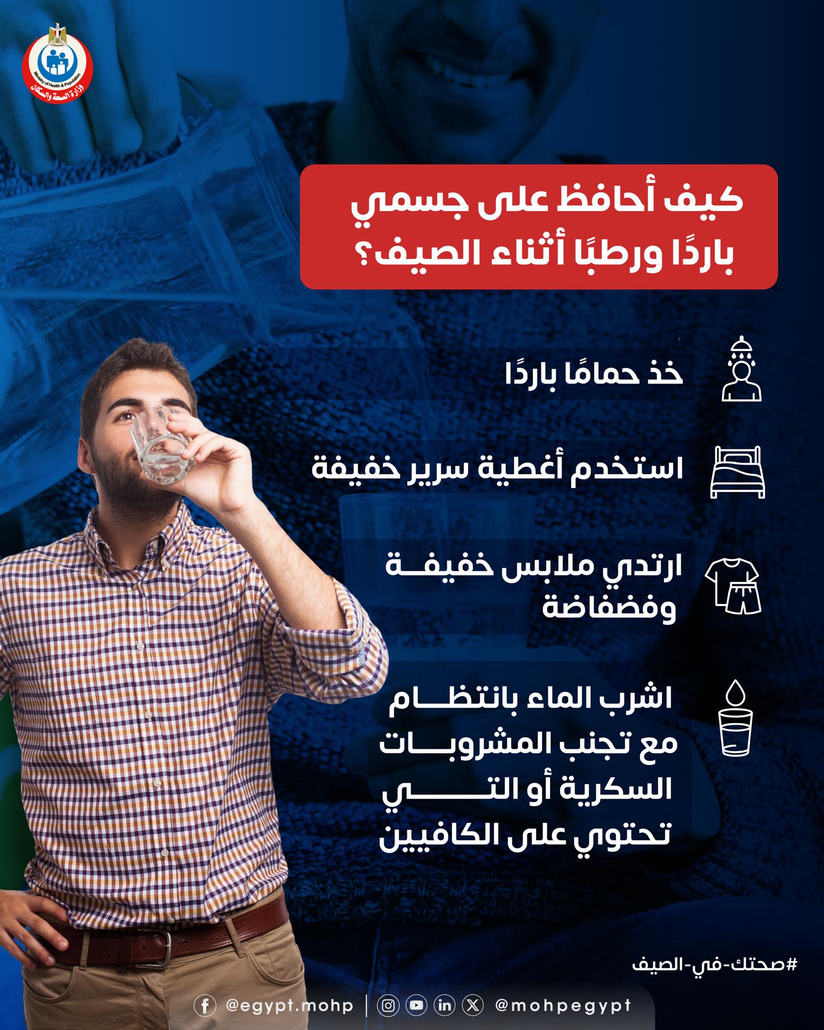 كما قدمت وزارة الصحة عدة نصائح للحفاظ على الجسم بارد ورطب خلال فصل الصيف، وهي:
