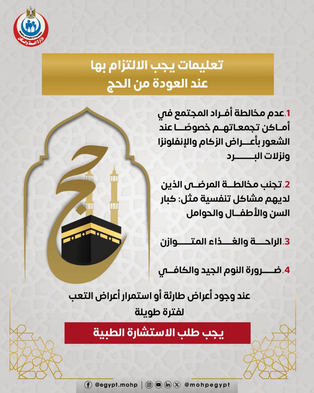 وجهت وزارة الصحة والسكان عبر حسابها الرسمي على موقع «فيس بوك»، تعليمات مهمة يجب التزام الحجاج بها عقب العودة من أداء مناسك الحج.