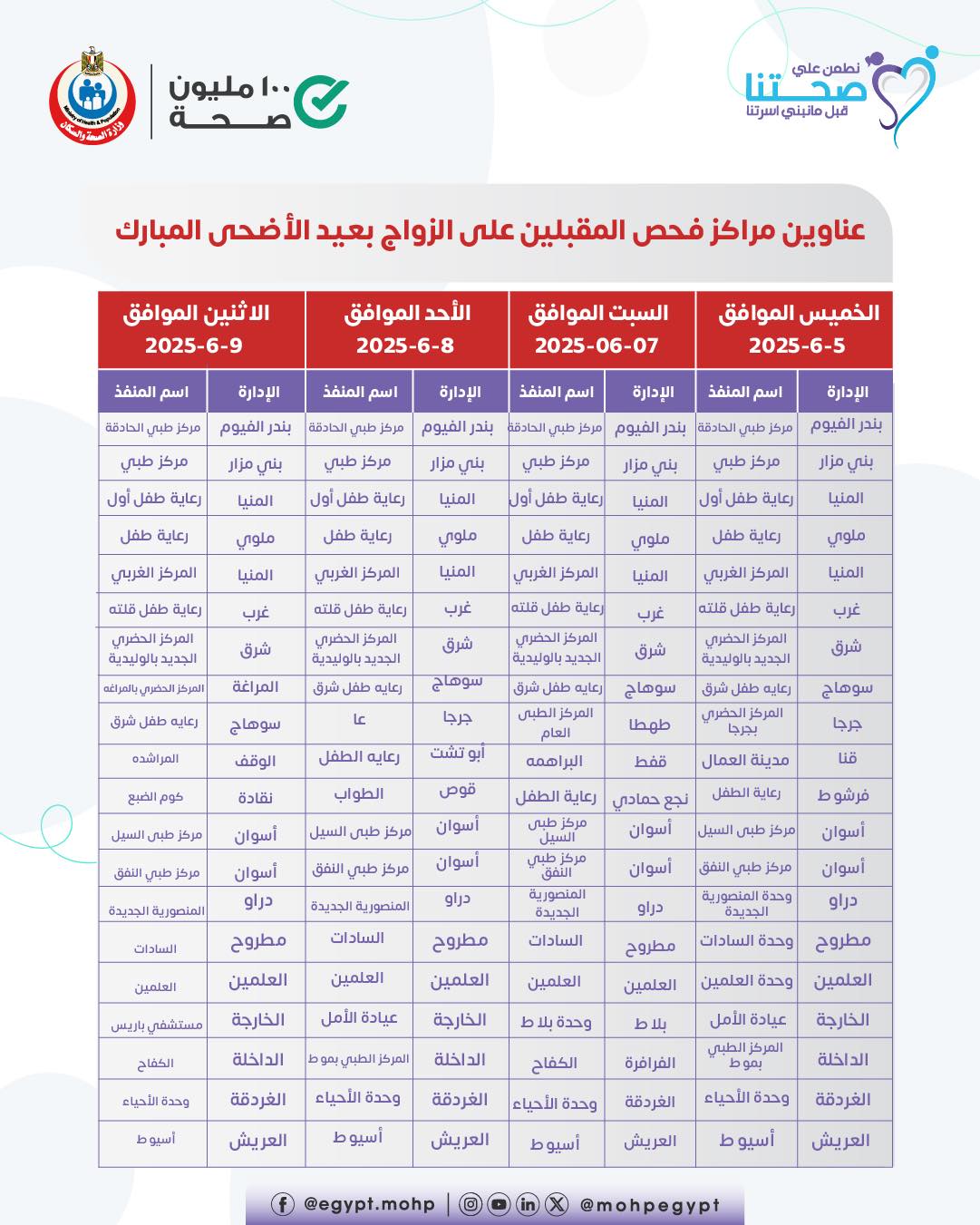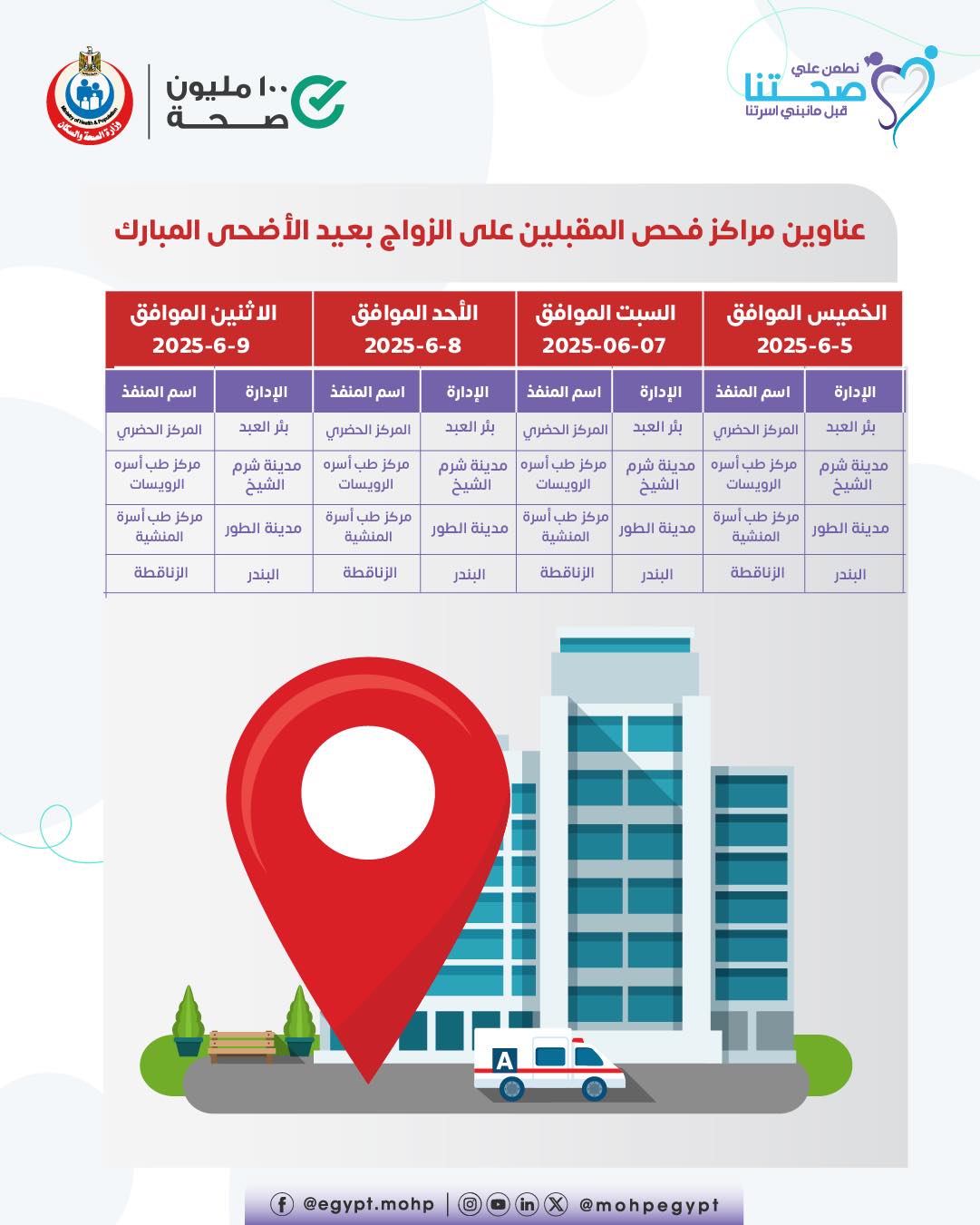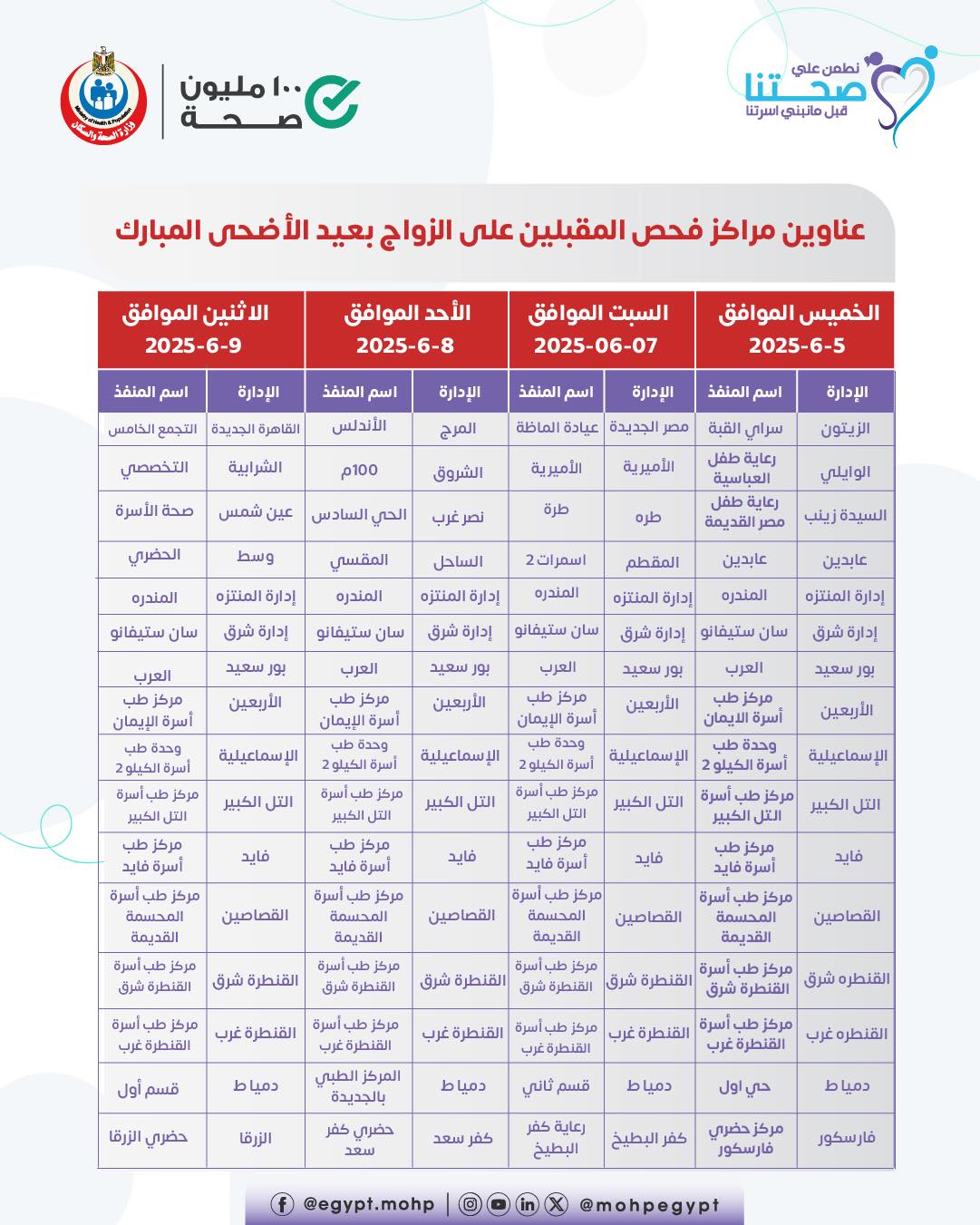 أعلنت وزارة الصحة والسكان عبر حسابها الرسمي بموقع “فيس بوك”، تخصيص العمل بـ58 مركزًا رئيسيًا بجميع محافظات الجمهورية لإجراء فحوصات المقبلين على الزواج، خلال فترة إجازة عيد الأضحى المبارك.