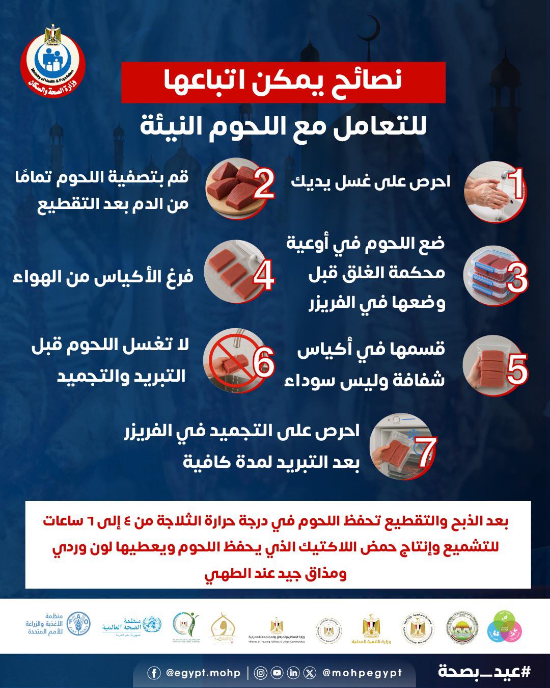 قدمت وزارة الصحة والسكان عبر حسابها الرسمي على موقع «فيس بوك»، 7 نصائح يمكن اتباعها للتعامل مع اللحوم النيئة خلال فترة عيد الأضحى المبارك.