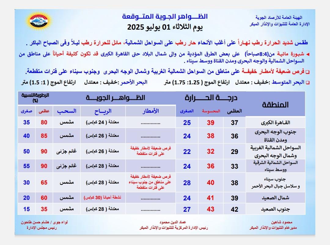 أعلنت هيئة الأرصاد الجوية عبر حسابها الرسمي على موقع «فيسبوك»، عن توقعات حالة الطقس اليوم الثلاثاء 1 يوليو.