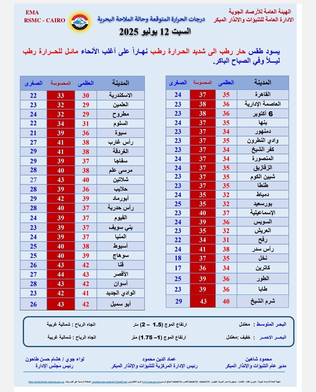 الوجه البحري ومدن القناة: العظمى 34 درجة – المحسوسة 37 – الصغرى 23 درجة مئوية.