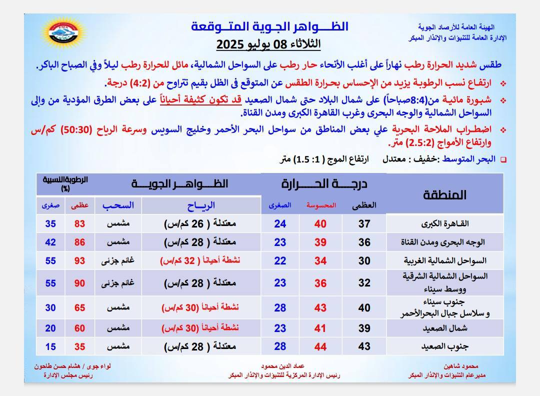أعلنت هيئة الأرصاد الجوية عبر صفحتها الرسمية على موقع «فيسبوك»، عن توقعات حالة الطقس اليوم الثلاثاء 8 يوليو.
