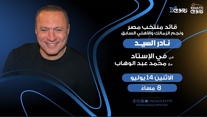 يستضيف محمد عبد الوهاب، الكابتن نادر السيد قائد منتخب مصر ونجم الزمالك والأهلي السابق، في أولى حلقات برنامج «في الاستاد» في موسمه الجديد، عبر «نجوم إف.إم» اليوم الإثنين 14 يوليو.
