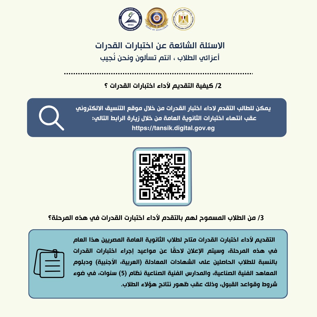 – سيتم الإعلان لاحقًا عن مواعيد إجراء اختبارات القدرات بالنسبة للطلاب الحاصلين على الشهادات المعادلة (العربية – الأجنبية)، ودبلوم المعاهد الفنية الصناعية والمدارس الفنية الصناعية المتقدمة نظام (5) سنوات في ضوء شروط وقواعد القبول.