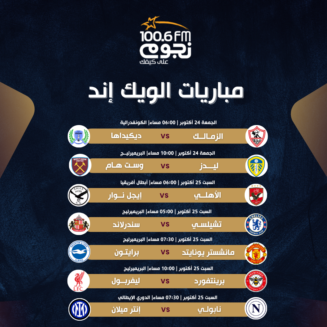 يشهد يوما الجمعة 24 أكتوبر، والسبت 25 أكتوبر، إقامة عدد من المباريات، أبرزها استئناف مشوار ناديي الأهلي والزمالك في بطولتي دوري أبطال إفريقيا والكونفدرالية، بالإضافة إلى عدة مواجهات في الدوريين الإنجليزي والإيطالي.