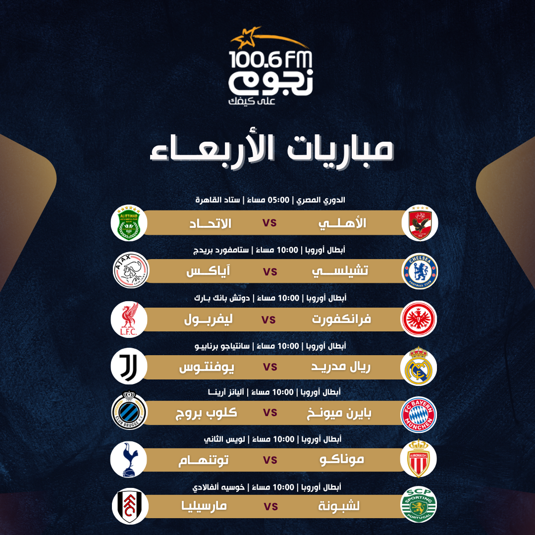 – بايرن ميونخ أمام كلوب بروج: يلتقي الفريقان على ملعب «آليانز آرينــا» في تمام الساعة العاشرة مساءً بتوقيت القاهرة، ضمن منافسات الجولة الثالثة من مرحلة الدوري لبطولة دوري أبطال أوروبا 2025-2026.