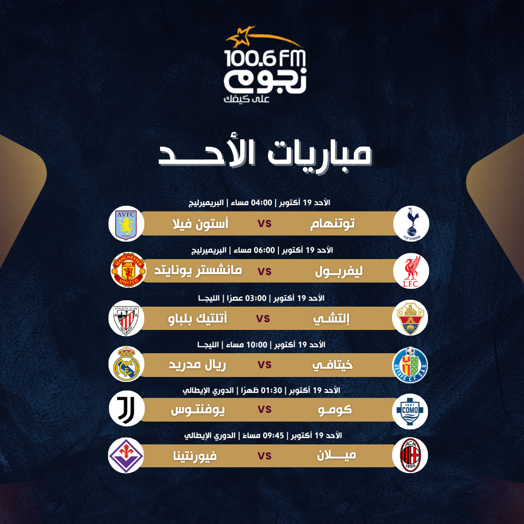يشهد اليوم الأحد 19 أكتوبر، إقامة عدد من المباريات على مستوى الدوريات المصرية، والإنجليزية، والإسبانية، والإيطالية، حيث يشهد ملعب “آنفيلد” قمة ليفربول ومانشستر يونايتد بـ«البريميرليج».
