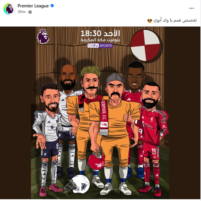 ونشرت الصفحة الرسمية للدوري الإنجليزي صورة كارتونية تتضمّن لاعبي ليفربول من جهة: محمد صلاح وأليكساندر إيزاك، ولاعبي مانشستر يونايتد من جهة أخرى: برونو فيرنانديز وبريان مبويمو، وفي المنتصف تظهر شخصيتا الكبير وهجرس للفنانين أحمد مكي ومحمد سلام من المسلسل الشهير «الكبير أوي»، وعلقت الصفحة على الصورة: «تخصص قمم يا ولد أبوي».