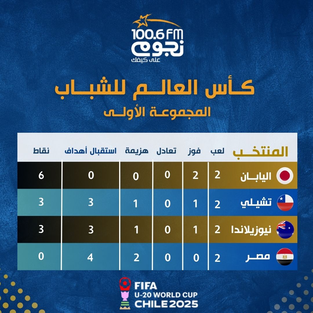 وتقام الجولة الثالثة من المونديال، بمواجهتين بين الفراعنة وتشيلي، واليابان أمام نيوزيلندا، في الثانية صباح السبت المقبل.