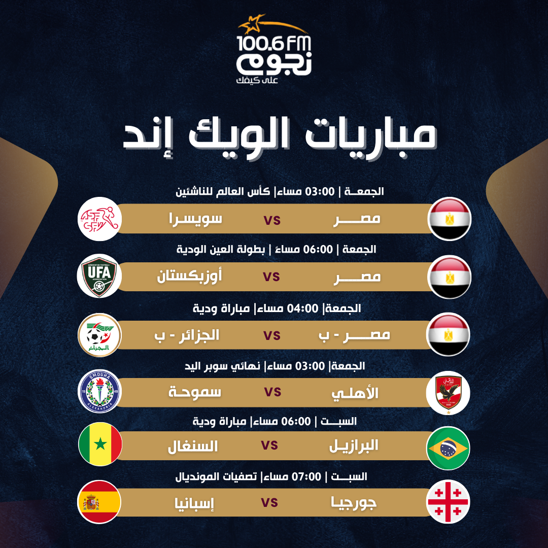 – منتخب مصر الثاني يلتقي الجزائر: يلتقي منتخب الفراعنة الثاني، نظيره الجزائر وديًا، على ستاد القاهرة الدولي، في الرابعة مساءً، وذلك استعدادا لمنافسات بطولة كأس العرب.