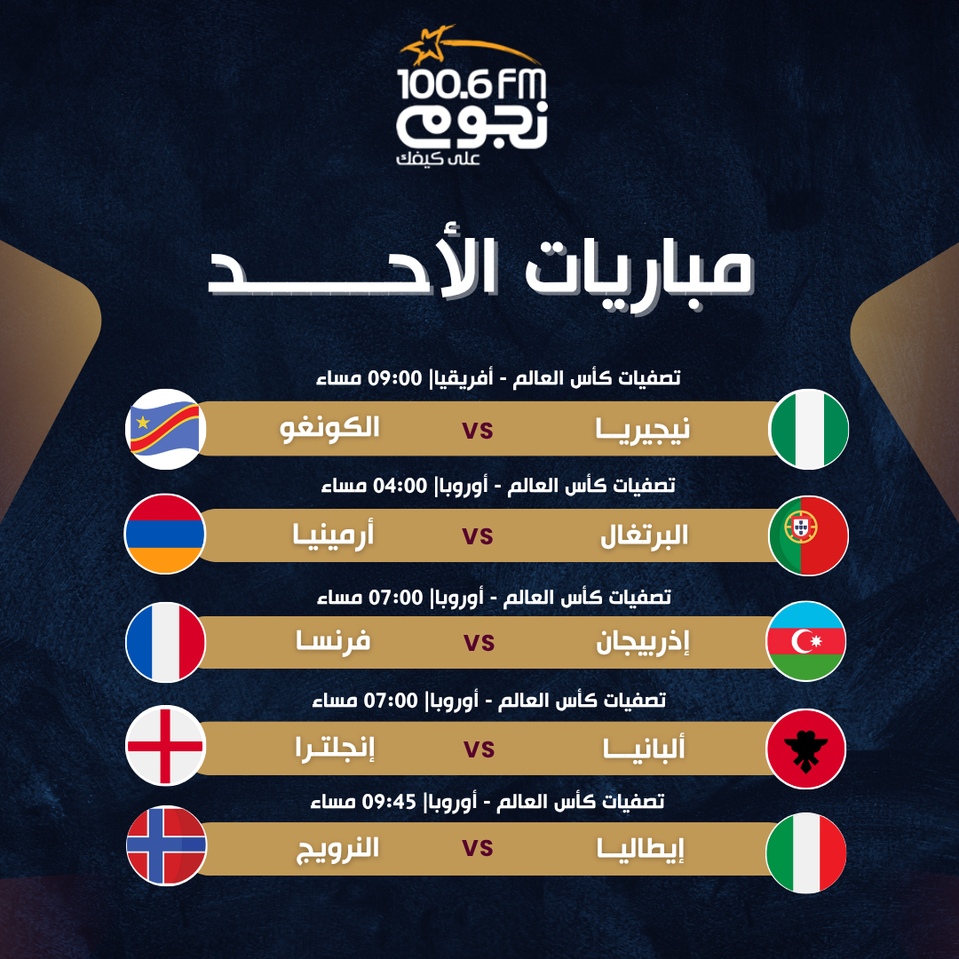 يشهد اليوم الأحد 16 نوفمبر، إقامة عدد من المباريات على مستوى التصفيات الأفريقية والأوروبية المؤهلة إلى بطولة كأس العالم، بمواجهات لمنتخبات: إنجلترا والبرتغال وإيطاليا، ونيجيريا.