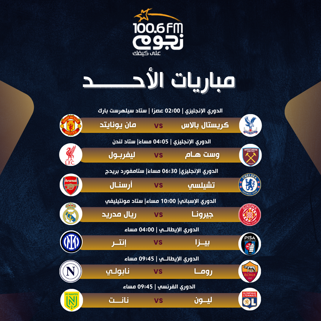 – روما أمام نابولي: تتجه الأنظار إلى ملعب «الأولمبيكو»، حيث يستضيف لقاء الفريقين في تمام الساعة 09:45 مساءً في الجولة الـ13 من مسابقة الدوري الإيطالي.