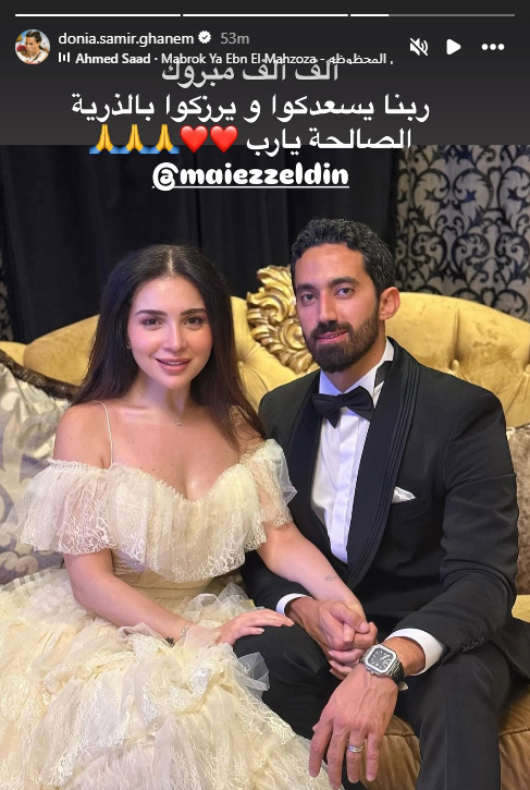 وهنأتها الفنانة دنيا سمير غانم وكتبت عبر ستوري حسابها في «إنستجرام»: «ألف ألف مبروك ربنا يسعدكم ويرزقكم بالذرية الصالحة يا رب».