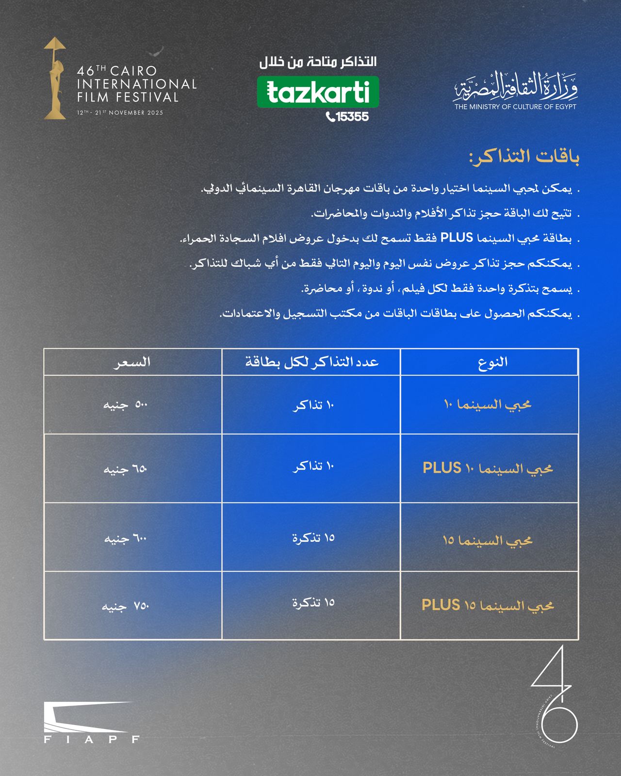 – يمكن لمحبي السينما اختيار واحدة من باقات مهرجان القاهرة السينمائي الدولي.