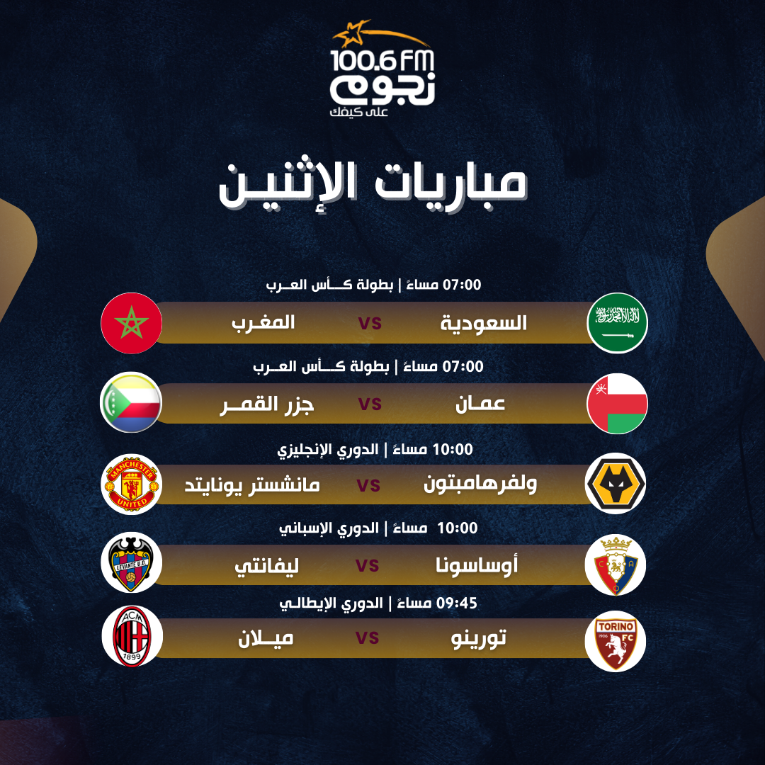 يشهد اليوم الإثنين 8 ديسمبر، إقامة عدد من المباريات على مستوى بطولة كأس العرب، بالإضافة إلى منافسات الدوري الإنجليزي، والدوري الإيطالي.