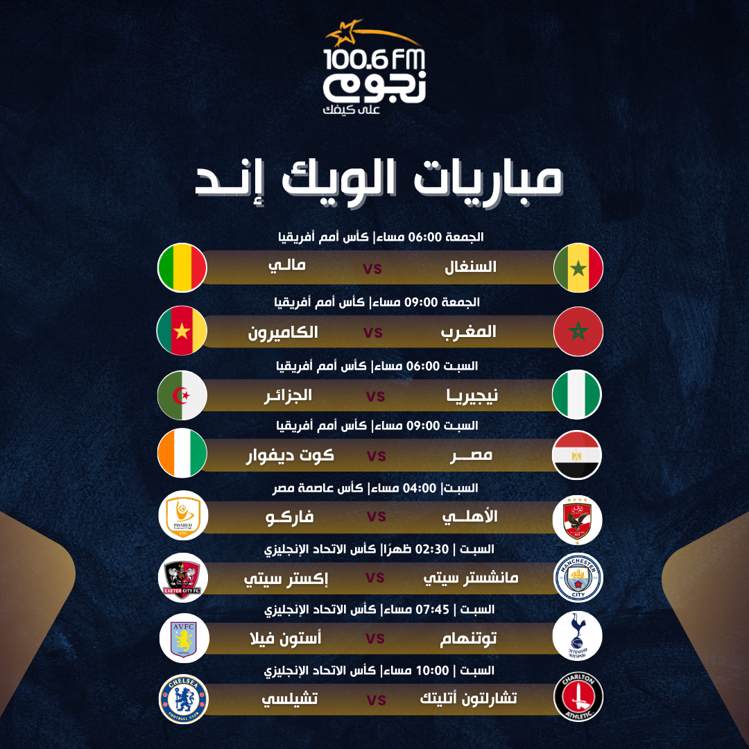 – نيجيريا تواجه الجزائر: تقام المباراة في تمام السادسة مساءً بتوقيت القاهرة، ضمن منافسات دور ربع النهائي من بطولة أمم أفريقيا.