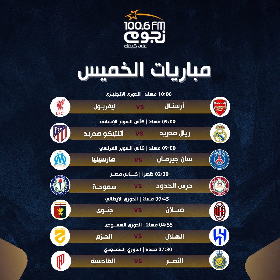 يشهد اليوم الخميس 8 يناير 2026، إقامة عدد من المباريات المهمة في الدوري الإنجليزي الممتاز، وكأس السوبر الفرنسي، بالإضافة إلى كأس السوبر الإسباني.