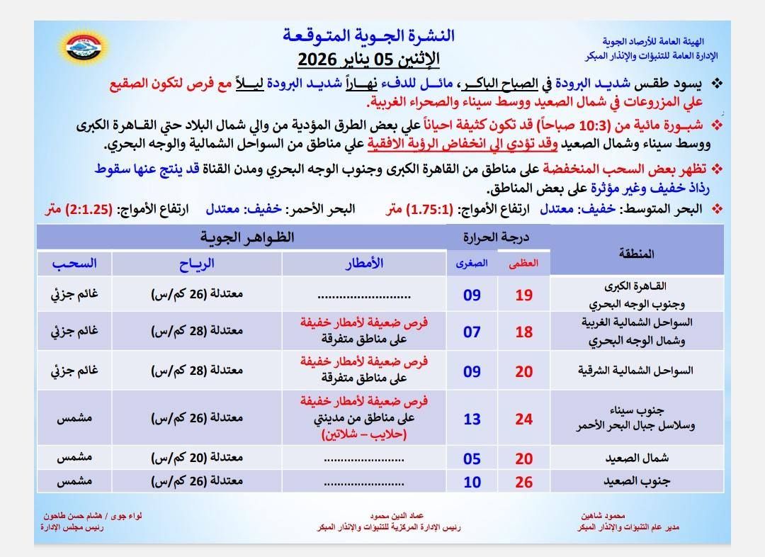 شمال الصعيد: العظمى 20 درجة، الصغرى 05 درجات.