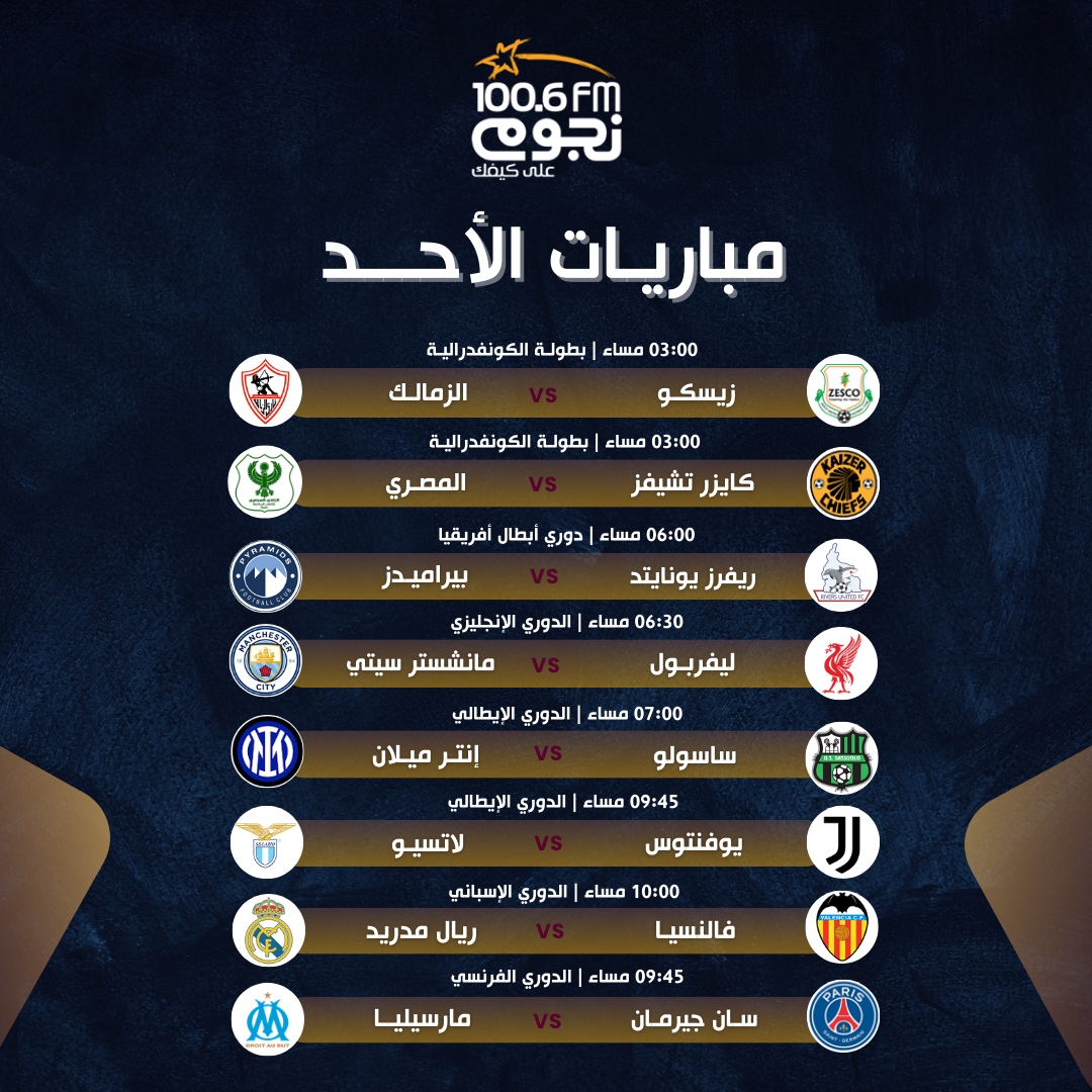 – كايزر تشيفز يواجه المصري البورسعيدي: يلتقي الفريقان على ملعب «بيتر موكابا» في جنوب أفريقيا، في تمام الثالثة مساء بتوقيت القاهرة، ضمن منافسات الجولة الخامسة من دور المجموعات في بطولة كأس الكونفدرالية الأفريقية.