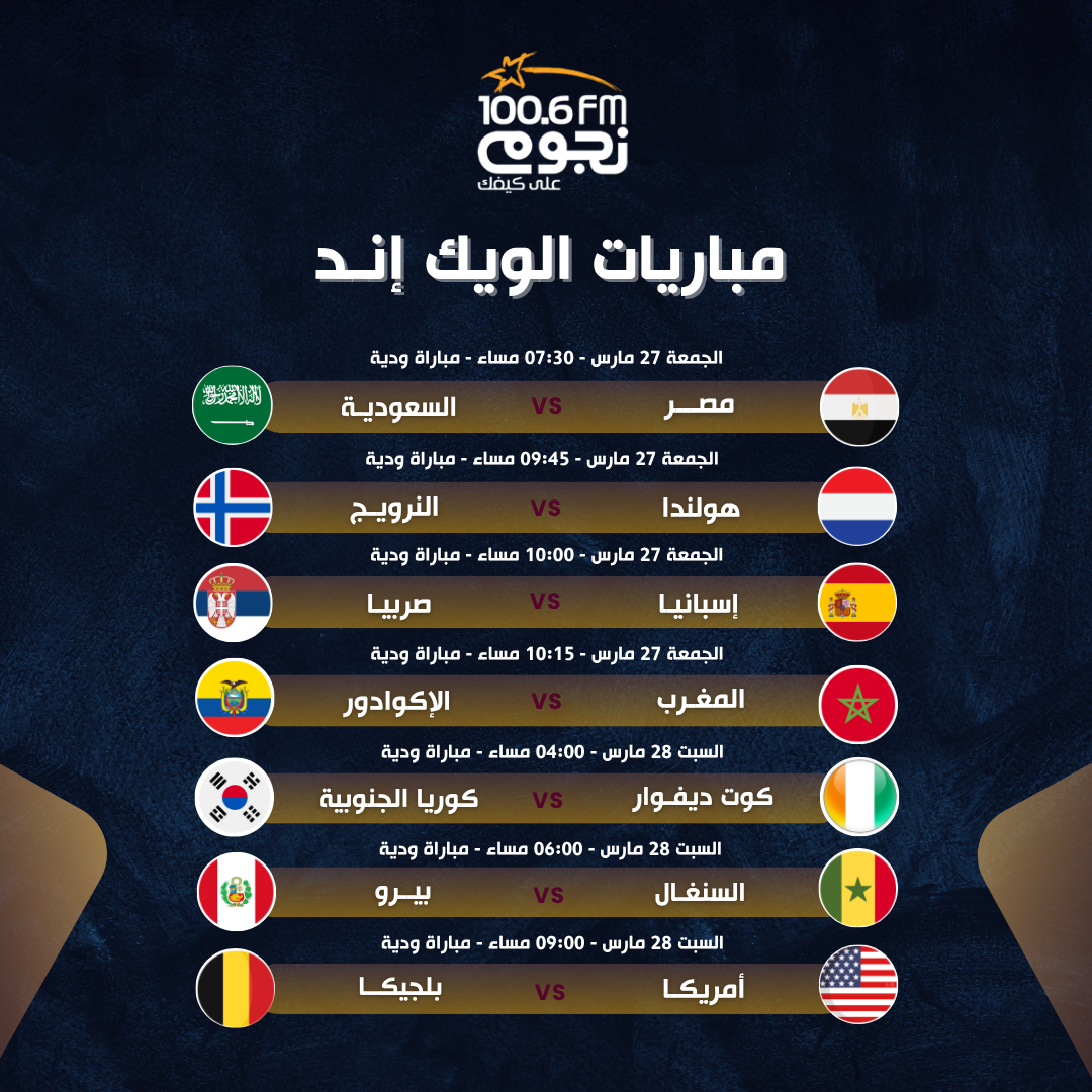 يشهد يوما الجمعة 27 مارس والسبت 28 مارس، إقامة عدد من المباريات الودية بين المنتخبات، ضمن فترة التوقف الدولي، وذلك في إطار الاستعداد لانطلاق بطولة كأس العالم 2026.
