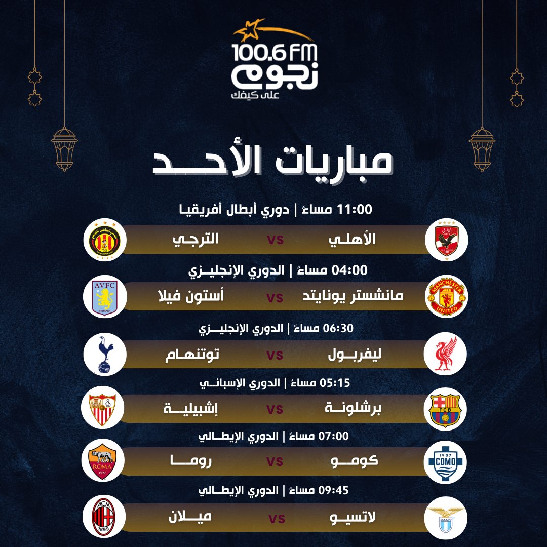 يشهد اليوم الأحد 15 مارس 2026، إقامة عدد من المباريات في مختلف المنافسات، يتصدرها لقاءات في الدوري الإنجليزي الممتاز، إلى جانب مباريات في دوري أبطال أفريقيا، والدوري الإسباني، والدوري الإيطالي.